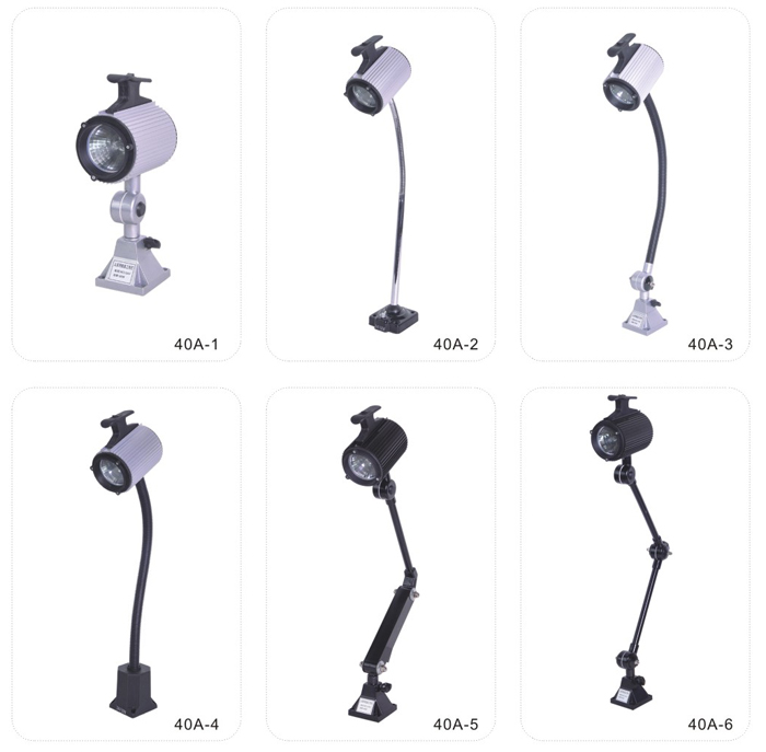 JS.109001 40A系列工作燈 40A-1工作燈采用新光源鹵鎢燈泡,光線柔和,聚光性好,適用各中小型機床,數(shù)控機床,鉆銑床、組合機床及其它設(shè)備的照明,并具有防水、防爆、防侵蝕等優(yōu)點。 40A-2、-3、-4工作燈底座350°旋轉(zhuǎn),照射角度可任意選擇,聚光效果好。